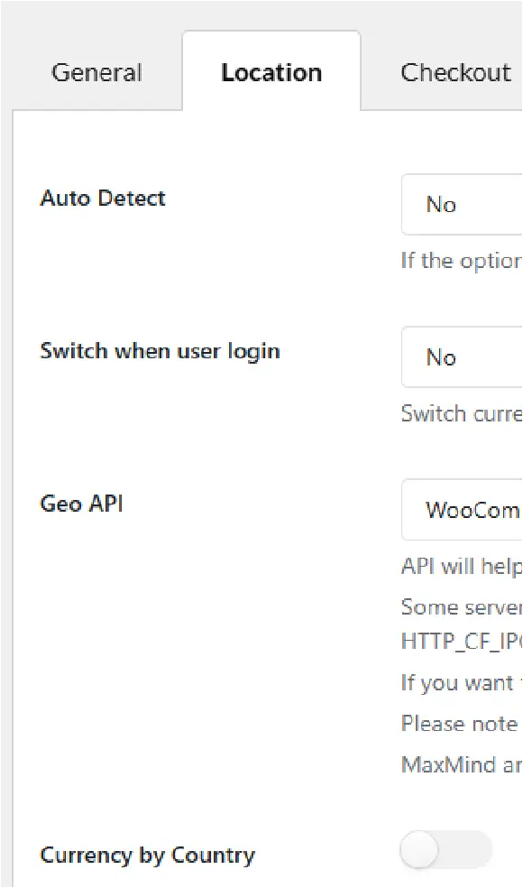 Detect currency based on customers’ country: The plugin will detect customers’ country based on their IP address, then select their currency to display prices, if option activated. Note: This option can be applied to detect at the country level, not working for states or provinces and regions within a country.